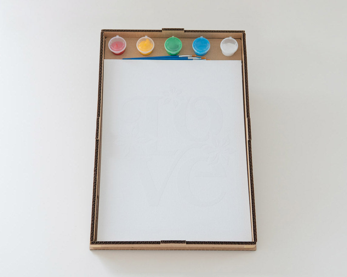 Inside the box, you'll find everything you need to get creative: 3 brushes, 5 acrylic paints, and a canvas with the stencil applied.